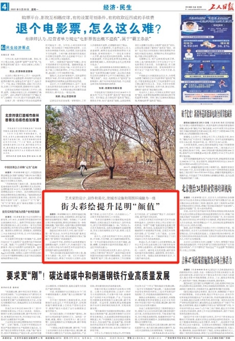 3月22日,《工人日报》第4版刊发文章《街头彩绘提升昆明“颜值”》,点赞昆明街头彩绘,一起来看。