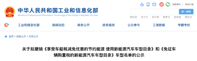 3月23日,工信部公示了拟撤销《享受车船税减免优惠的节约能源使用新能源汽车车型目录》和《免征车辆购置税的新能源汽车车型目录》车型名单,涉及比亚迪e5和e6、理想ONE LXA6500SHEVM1等汽车型号。