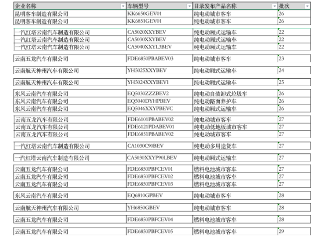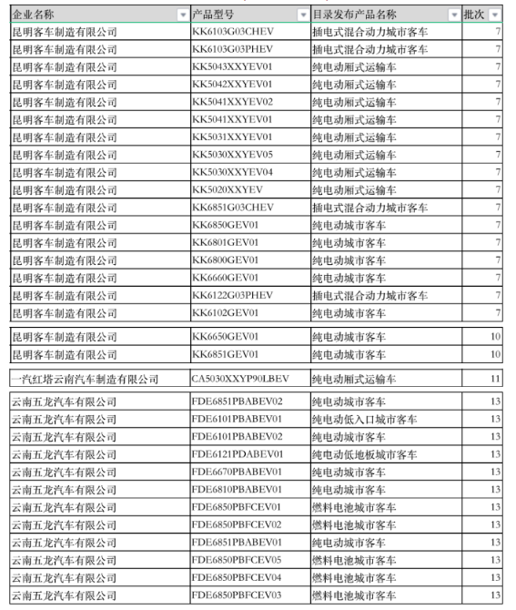拟撤销《享受车船税减免优惠的节约能源使用新能源汽车车型目录》的车型名单(云南企业部分)