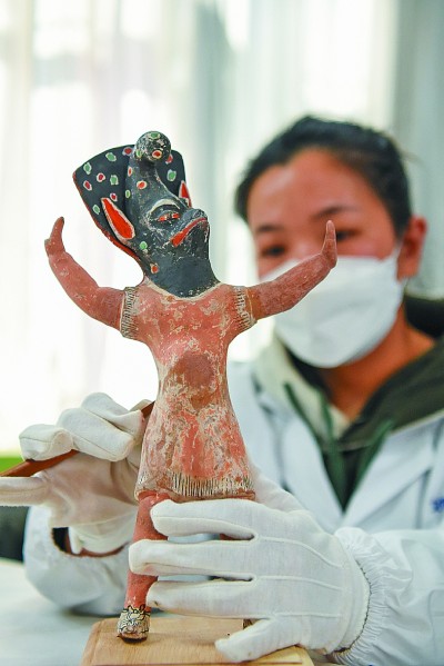 在新疆博物馆文物科技保护中心,工作人员对彩绘戴面具舞蹈泥俑的颜料层进行加固。新华社发