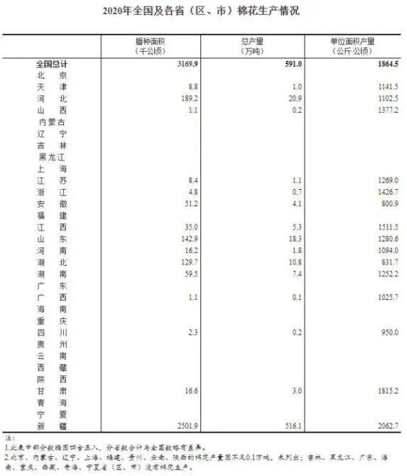 2020年全国及各省(区、市)棉花生产情况。来源:国家统计局