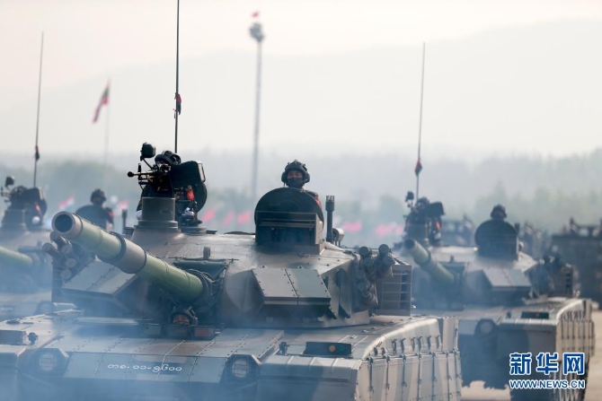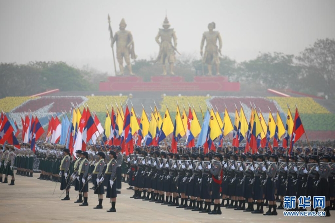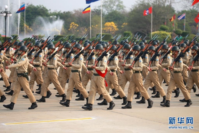 3月27日,士兵在缅甸内比都参加建军76周年阅兵式。新华社记者 张东强 摄