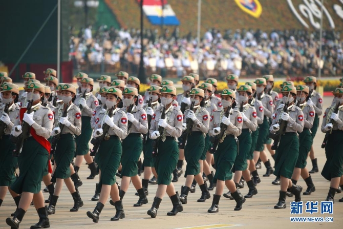3月27日,女兵在缅甸内比都参加建军76周年阅兵式。新华社记者 张东强 摄