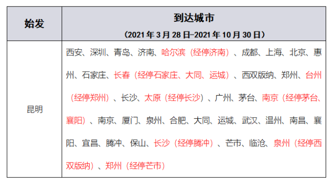 主运营基地昆明方面,换季后昆航将新开KY3077/3078次“昆明-西双版纳-泉州”航班,每周二、四、六执飞;复航KY8287/88次“昆明-武汉”航班,每周一、三、五、七执飞;“昆明-石家庄”调整为KY8249/50次“昆明-石家庄-长春”航班,每天执飞;“昆明-长沙”调整为KY3002/01次“昆明-长沙-太原”航班,每天执飞;KY8269/70次“昆明-北京”航班将继续为购买客票的旅客提供餐食服务;同时2021年4月1日起,昆航空将在“昆明-北京”、“昆明-上海”航线中为公务舱旅客提供选餐服务,具体可至昆明航微信公众号或昆明航官网了解,昆明基地通航城市如下所示: