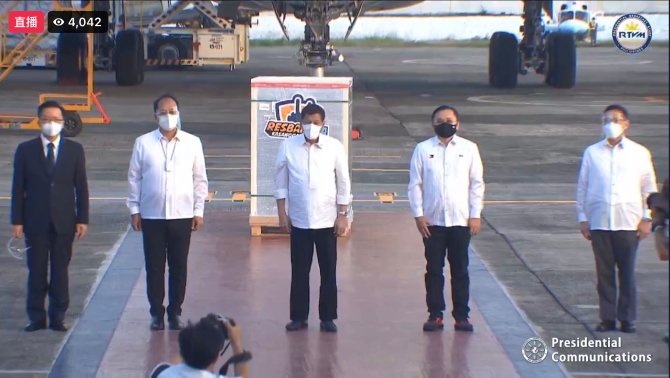 3月29日,菲律宾政府采购的首批中国科兴新冠疫苗运抵马尼拉比利亚莫尔空军基地。菲律宾总统杜特尔特和中国驻菲大使黄溪连赴机场迎接并出席疫苗移交仪式。菲参议员克里斯托弗·吴、卫生部长杜凯、政府应对疫情总协调人加尔维兹等出席活动。杜特尔特与黄溪连亲手为满载中国疫苗的集装箱贴上标有“疫苗帮助我们战胜新冠病毒”的疫苗接种计划宣传海报,并当场取出疫苗样本进行展示。