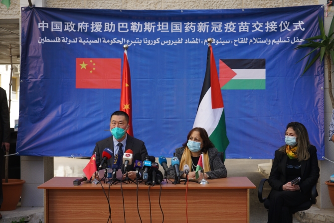 据中国驻巴勒斯坦办事处网站消息,3月29日,中国政府援助巴勒斯坦国药新冠疫苗运抵拉马拉。驻巴勒斯坦办事处主任郭伟、巴卫生部长凯莱共同出席在巴卫生部举行的疫苗交接仪式。