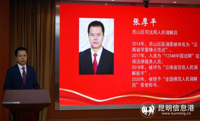 来自西山区司法局的人民调解员张厚平,曾入选“12348中国法网”驻场法律服务人员,先后获得“云南省百佳人民调解能手”“全国模范人民调解员”等荣誉称号。工作10年来,他时刻心系群众成为了一位有温度、有智慧的人民调解员,为妥善解决所在地区难点热点问题、化解医疗矛盾纠纷、维护社会和谐稳定做出了积极努力。