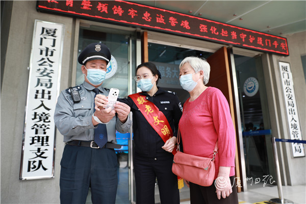 2、陪伴服务全流程。厦门出入境加强出入境办证大厅自助设备人工引导服务,设置党员先锋岗,安排党员民警为没有亲属陪伴的老年人提供一对一全流程陪伴式服务,为使用智能自助设备有困难的老年人提供全流程引导办理,方便老年人享有智能化服务。