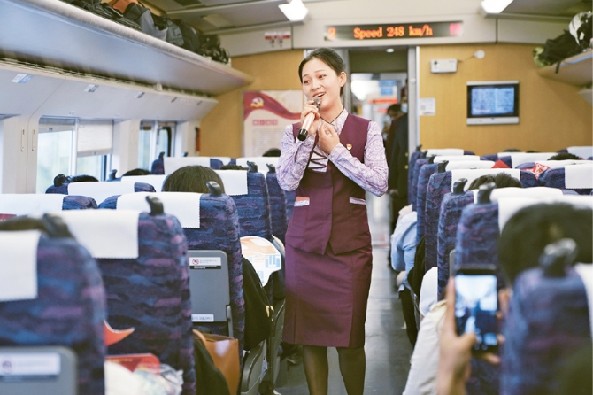 2021年3月19日,从广西南宁东站开往全州南站的D9688次列车,成为党史学习教育的“流动课堂”,通过张贴标语、提供红色影音和读物、组织“流动党史课”等“寓学于途”。图为铁路工作人员在列车上演唱歌曲《我和我的祖国》。 新华社记者 杨驰/摄
