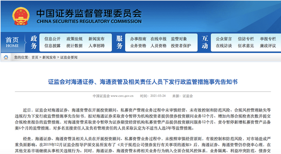 3月24日,证监会对海通证券、海通资管在开展投资顾问、私募资产管理业务过程中未审慎经营、未有效控制和防范风险、合规风控管理缺失等违规行为下发行政监管措施事先告知书,拟对海通证券采取责令暂停为机构投资者提供债券投资顾问业务12个月、增加内部合规检查次数并提交合规检查报告的监管措施,对海通资管采取责令暂停为证券期货经营机构私募资管产品提供投资顾问服务12个月、责令暂停新增私募资管产品备案6个月的监管措施,对多名直接责任人及负有管理责任的人员采取认定为不适当人选2年等监管措施。