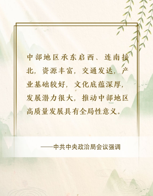 3月30日,习近平总书记主持中共中央政治局会议,审议《关于新时代推动中部地区高质量发展的指导意见》,为新时代中部地区高质量发展指明方向。会议强调,要推动中部地区加快崛起,在全面建设社会主义现代化国家新征程中作出更大贡献。