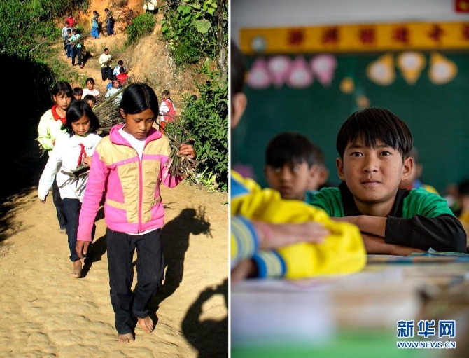 这张拼版照片的左图:2003年12月6日,云南省澜沧拉祜族自治县富邦乡半山村小学的学生李娜儿(前)在拾柴(新华社记者 李银 摄);右图:2021年3月2日,李娜儿的儿子在富邦乡中心完小五年级的课堂上(新华社记者 江文耀 摄)。新华社发