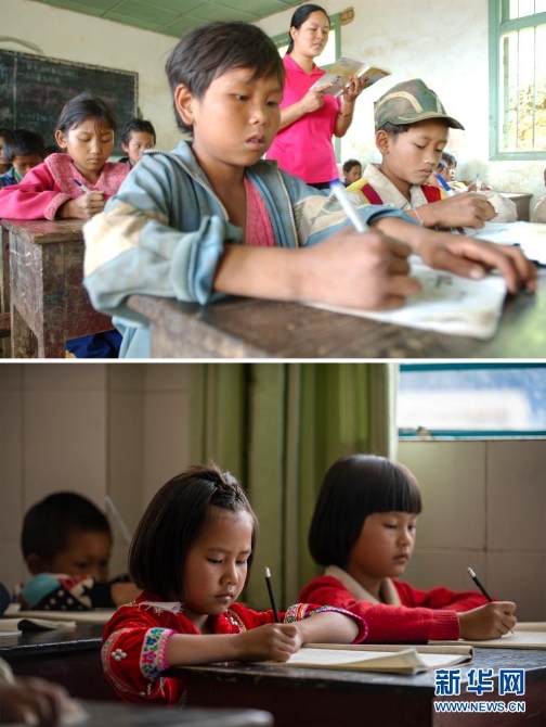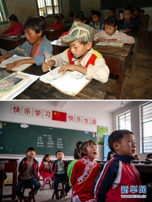 这张拼版照片的上图:2003年12月6日,云南省澜沧拉祜族自治县富邦乡半山小学的孩子们在上课(新华社记者 李银 摄);下图:2021年3月2日,云南省澜沧拉祜族自治县富邦乡半山小学已撤并到富邦乡中心完小,这是孩子们在教室里上课(新华社记者 江文耀 摄)。新华社发
