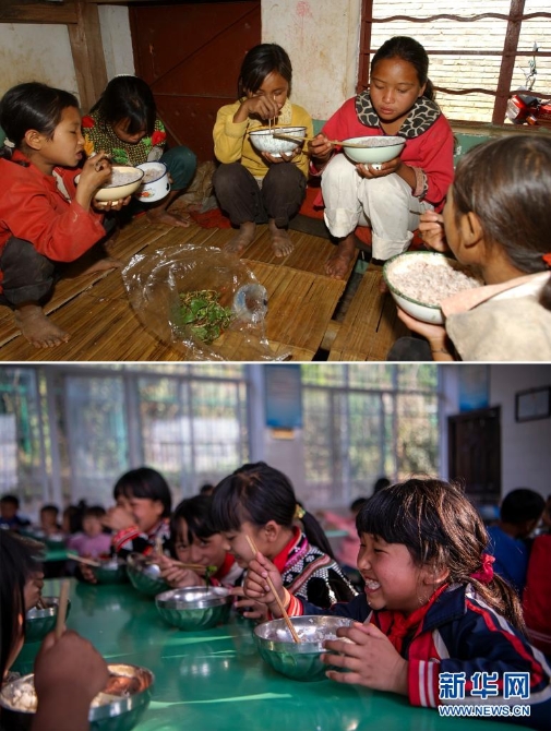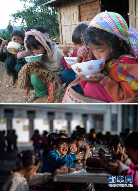 这张拼版照片的上图:2003年12月6日,云南省澜沧拉祜族自治县富邦乡半山村小学的孩子们在吃饭(新华社记者 李银 摄);下图:2021年3月2日,云南省澜沧拉祜族自治县富邦乡半山村小学已撤并到富邦乡中心完小,这是孩子们在吃饭(新华社记者 江文耀 摄)。新华社发
