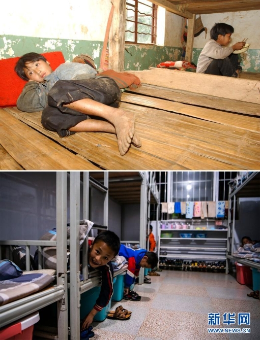这张拼版照片的上图:2003年6月13日,云南省澜沧拉祜族自治县木戛乡哈卜吗村小学的孩子在宿舍休息(新华社记者 秦晴 摄);下图:2021年3月3日,云南省澜沧拉祜族自治县木戛乡哈卜吗村小学的孩子们准备睡觉(新华社记者 江文耀 摄)。新华社发