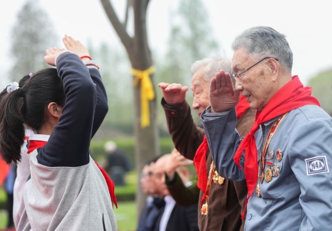 4月2日,2021年上海市社会各界清明感恩典礼现场,少先队员向新四军老战士敬礼。新华社记者丁汀摄