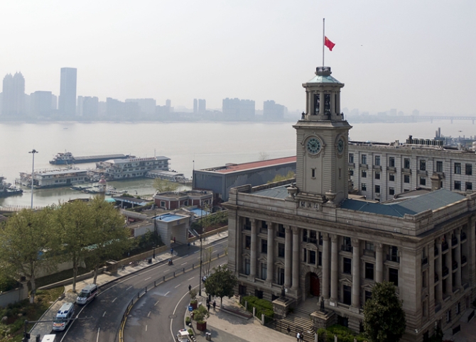 ↑2020年4月4日,武汉市举行哀悼活动,表达对抗击新冠肺炎疫情斗争牺牲烈士和逝世同胞的深切哀悼。这是武汉江汉关大楼下半旗志哀。新华社记者 熊琦 摄