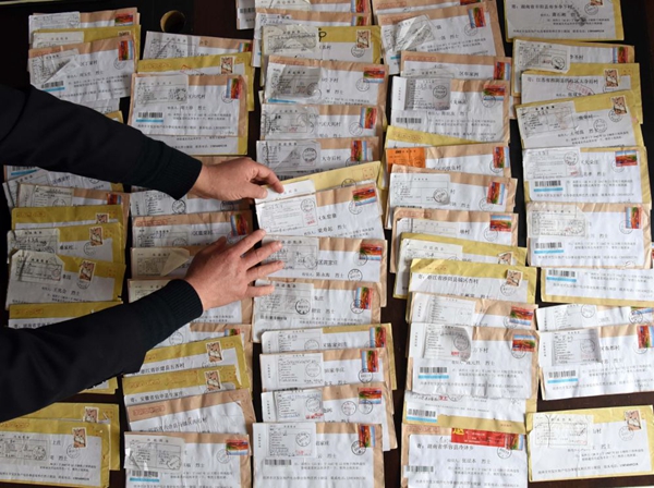 ↑2008年,时任山东省菏泽市张和庄村党支部书记的张景宪决心为张和庄烈士陵园的无名烈士找到家乡和亲人,告慰他们的英灵。从2014年开始,张景宪按照先前寻访到的资料地址,通过寄信等方式至今已为38位烈士找到亲人。这是2019年3月20日,张景宪在整理多年来他收到的退信。新华社记者王凯摄