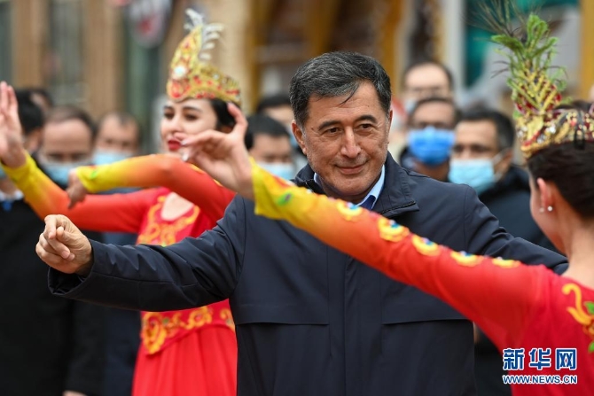 在新疆国际大巴扎,上海合作组织秘书长诺罗夫与舞蹈演员一起跳新疆舞(3月30日摄)。新华社记者 丁磊 摄