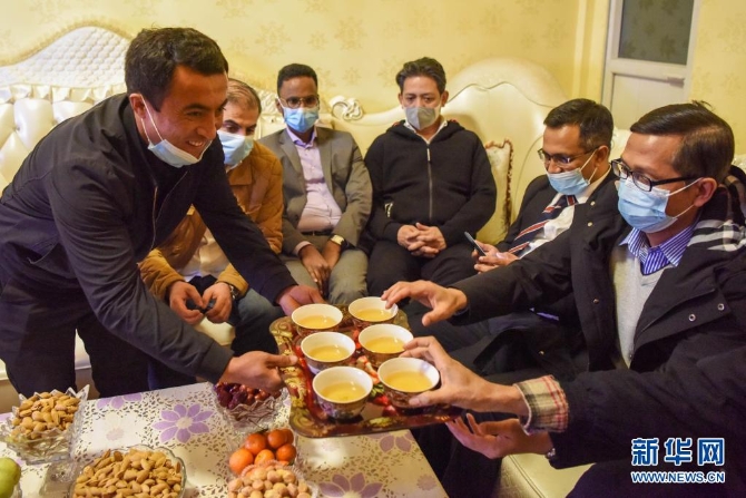 来疆参访代表团成员来到新疆喀什市乃则尔巴格镇尤喀克喀孜热克村一村民家中走访(3月31日摄)。新华社记者 丁磊 摄