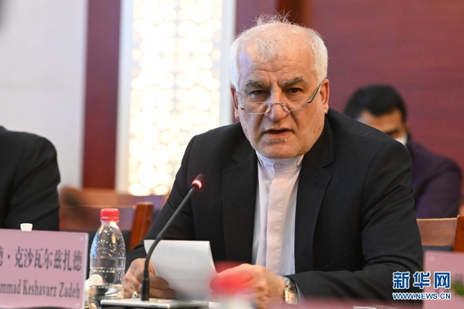 4月2日,伊朗驻华大使穆罕默德·克沙瓦尔兹扎德在交流会上发言。新华社记者 丁磊 摄
