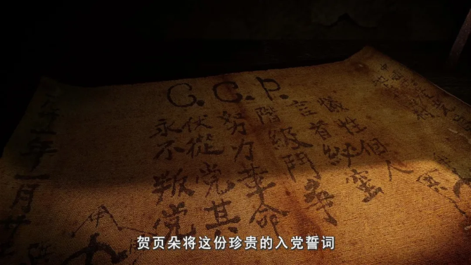 “牺牲个人,言首泌蜜(严守秘密),阶级斗争,努力革命,伏(服)从党其(纪),永不叛党”。红布两边留下了自己的姓名与入党的时间、地点:中国共产党党员贺页朵;地点北田村;1931年1月25日。虽然这份誓词24个字中有6个错别字,饱经沧桑、陈旧模糊,但目睹者无不深深震撼于书写者贺页朵对革命的坚定信念、对党的无限忠诚。