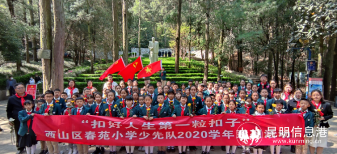 西山区春苑小学围绕庆祝中国共产党成立100周年,落实立德树人根本任务,组织中共党员、共青团员和少先队员代表来到西山公园聂耳墓,开展“扣好人生第一粒扣子,传承红色基因”清明祭英烈主题教育大队活动。活动中,少先队员们齐唱中国少年先锋队队歌及儿童歌曲《卖报歌》,聆听聂耳事迹,向聂耳鞠躬敬献菊花,深切悼念为革命事业前仆后继、英勇献身的先烈,缅怀先辈。
