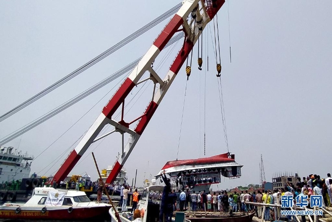 4月5日,搜救人员在孟加拉国纳拉扬甘杰地区打捞起沉船。新华社发