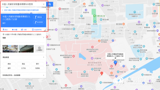 记者注意到,医院大门口的石碑上确实写着“中国人民解放军联勤保障第920医院”,医院内的大楼顶上也竖有“中国人民解放军联勤保障第920医院”几个大字。通过百度查询地图信息,同样显示医院名称为“中国人民解放军联勤保障第920医院”,大观路上的公交站台信息则是“四十三医院公交车站”。无论搜索哪个名字,都能正确指示医院的地理位置。