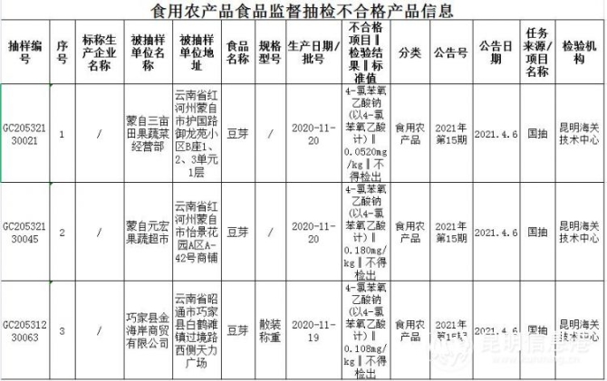 检出蒙自三亩田果蔬菜经营部、蒙自元宏果蔬超市、巧家县金海岸商贸有限公司销售的豆芽,4-氯苯氧乙酸钠(以 4-氯苯氧乙酸计)不符合食品安全国家标准要求。