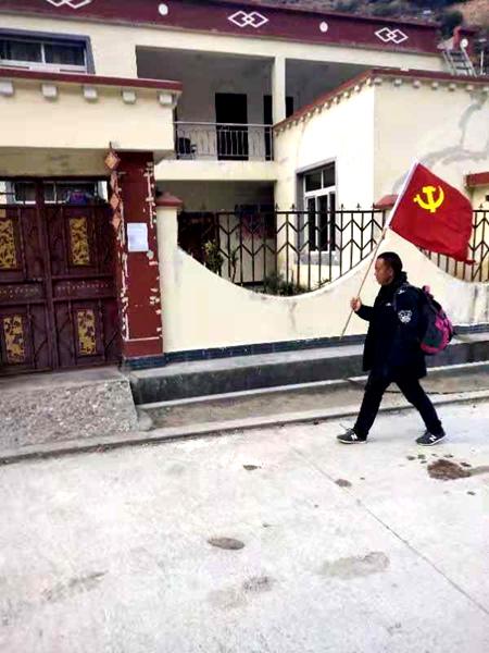 龙新文手擎红旗下乡普法。和金龙摄