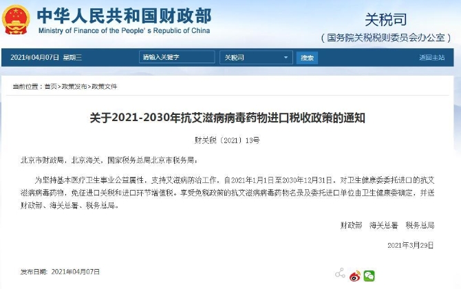 《通知》指出,为坚持基本医疗卫生事业公益属性,支持艾滋病防治工作,自2021年1月1日至2030年12月31日,对卫生健康委委托进口的抗艾滋病病毒药物,免征进口关税和进口环节增值税。