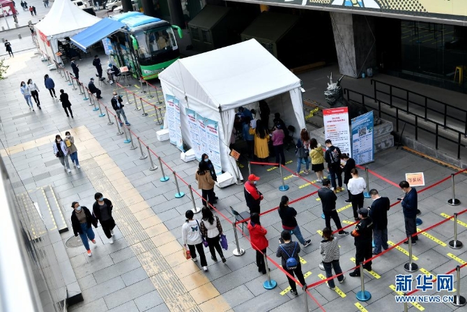 4月7日,市民在北京西单商业区设立的疫苗接种点排队接种疫苗。新华社记者 李鑫 摄