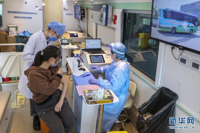 4月7日,医护人员在移动疫苗接种车上为市民接种新冠疫苗。新华社记者 张玉薇 摄