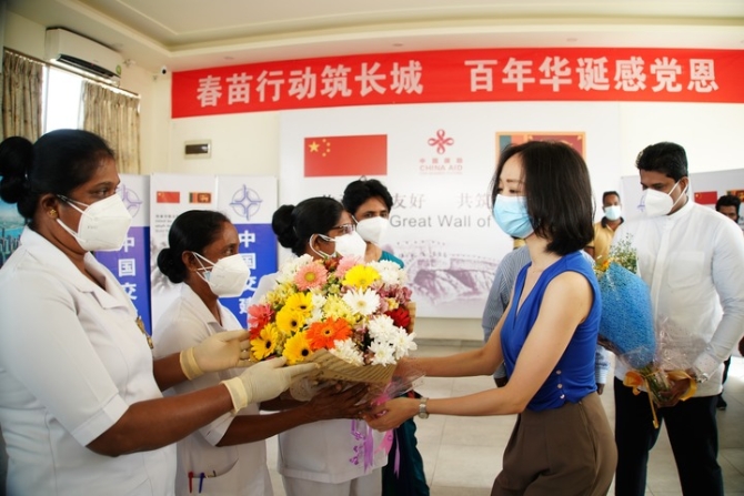4月5日,在科伦坡港口城接种点,一名中国公民代表向当地医护人员献花致谢。新华社 记者唐璐/摄