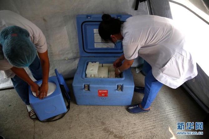 4月7日,在尼泊尔加德满都一家医院,工作人员在转运新冠疫苗。新华社发(苏拉韦·什雷斯塔/摄)