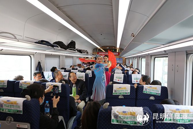 列车上,昆明局集团昆明客运段的金花列车员与交通厅党员开展党史知识竞赛、讲述党史故事、齐唱红歌、“十送红军”舞蹈表演等活动,进一步激发大家学习党史的热情。