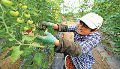 山东菏泽市曹县孙老家镇程庄村建立五色西红柿生产基地,解决了村民就业问题。图为4月8日,村民在大棚里采摘五色西红柿。董西德摄(影像中国)