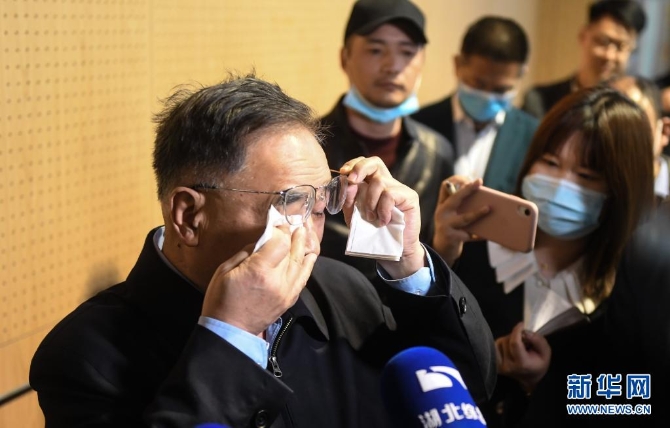 4月9日,张伯礼院士(左一)在武汉江夏方舱医院回忆疫情期间在此奋斗的历程时落泪。新华社记者程敏摄