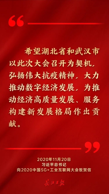 2020年11月,总书记向中国5G+工业互联网大会发来贺信,信中说:“大会在湖北武汉召开有着特殊意义。希望湖北省和武汉市以此次大会召开为契机,弘扬伟大抗疫精神,大力推动数字经济发展,为推动经济高质量发展、服务构建新发展格局作出贡献。”