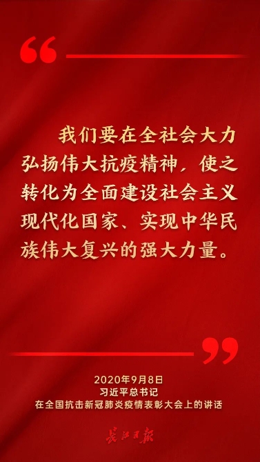 总书记在全国抗击疫情表彰大会上指出:“我们要在全社会大力弘扬伟大抗疫精神,使之转化为全面建设社会主义现代化国家、实现中华民族伟大复兴的强大力量。”