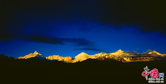 梅里雪山地处滇、川、藏三省结合部,横断山脉中段怒江与澜沧江之间,北连西藏阿冬格尼山,南与碧罗雪山相接,平均海拔在6000米以上的有十三座山峰,俗称“太子十三峰”。它也是三江并流世界自然遗产腹心地,以其巍峨壮丽、神秘莫测而闻名于世,卡格博峰下,冰斗、冰川连绵,犹如玉龙伸延,冰雪耀眼夺目,是世界稀有的海洋性现代冰川。山下的曲登阁寺、衮玛顶寺(飞来寺)是藏族群众朝拜神山的寺宇。