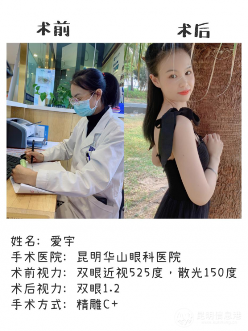 经过了详细的术前检查,检查结果显示爱宇的双眼近视525度、散光150度,考虑到爱宇的工作对视觉质量要求较高,所以华山眼科医疗集团副总院长、昆明华山眼科医院屈光专科主任李旭松教授为爱宇选择了最适合她的精雕C+手术。
