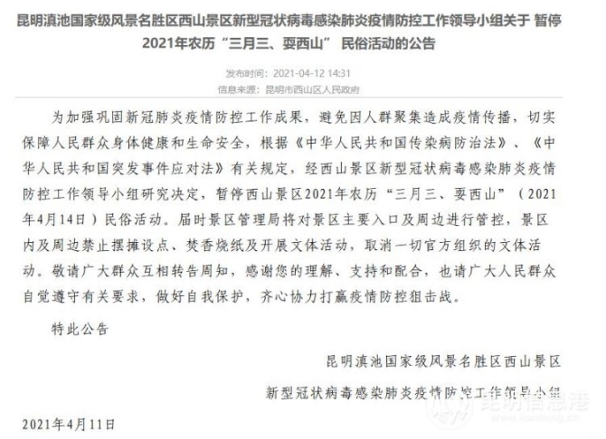 昆明信息港讯 记者曹月 4月11日,昆明滇池国家级风景名胜区西山景区新型冠状病毒感染肺炎疫情防控工作领导小组在西山区人民政府网站发布公告,将暂停4月14日的西山景区2021年农历“三月三、耍西山”民俗活动。