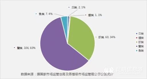 在这些不合格产品中,蟹类检出共计106批次,占比60%左右,且以梭子蟹为主要检出品类,虾类共检出60批次,占比34%,以皮皮虾主要检出品类。鱼类、贝类、螺类检出镉超标偶有发生。