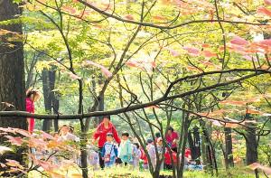 经过10多年的景观打造,黑龙潭公园已种植有红枫、枫香、元宝枫、鸡爪槭等共计6000多株枫树,红枫岭和秋色景观大道美景深受游客喜爱。目前正值深春时节,公园内除了枫香,其余很多枫叶都火红一片,途经龙泉观、龙泉探梅广场,沿阶而上到达红枫岭,都能看到红枫,远远看上去就像秋季山间里的“橙红橘绿”。很多游客赏着红叶,赞美之声不绝于耳。