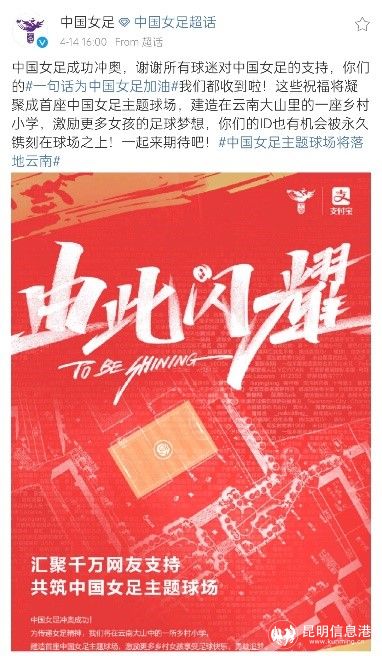 4月8日,东京奥预赛附加赛首回合赛前,中国足协携手支付宝,联合人民日报体育、新华社体育、新浪微博等众多媒体力量,组成玫瑰加油阵线,共同发起#一句话为中国女足加油#话题活动,征集网友留言,为中国女足加油,共筑玫瑰梦想球场。从8号到14号的一周时间里,超过1亿网友参与这一话题,祝福中国女足。14日,女足官微公布玫瑰梦想球场更多信息,这座凝聚亿万网友祝福的女足主题球场将建在云南,而所有参与祝福的网友ID,都有机会被镌刻在球场边,与女足精神一起,激励和见证孩子们在足球场上的成长与快乐。