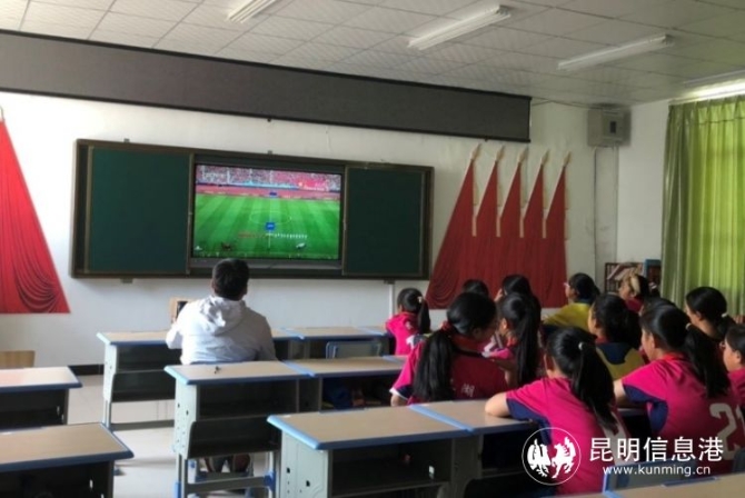 云南石林追风小学的女足队员在学校多媒体教室集体看球