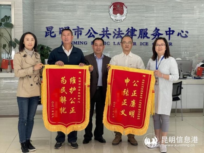 3月26日,两名法援受援人向昆明市法律援助中心和云南弘同律师事务所送上“维护正义 为民解忧”锦旗,感谢法援中心和律师为退役军人成功维权。