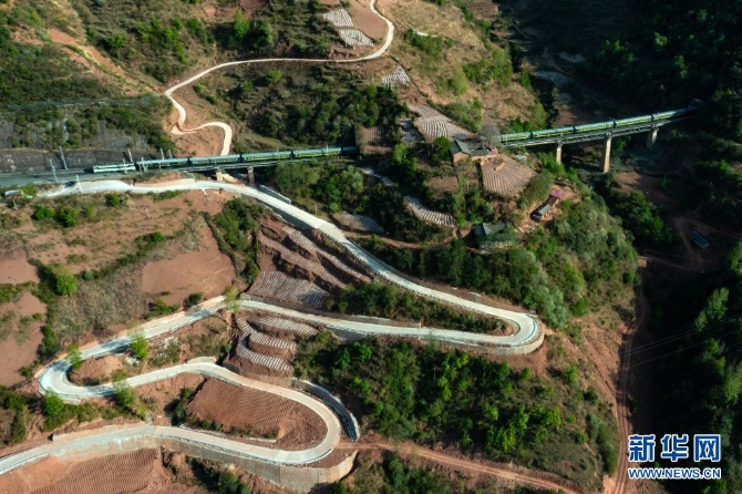 这是即将抵达成昆铁路沙马拉达站的5634次列车和通站公路(4月11日摄,无人机照片)。